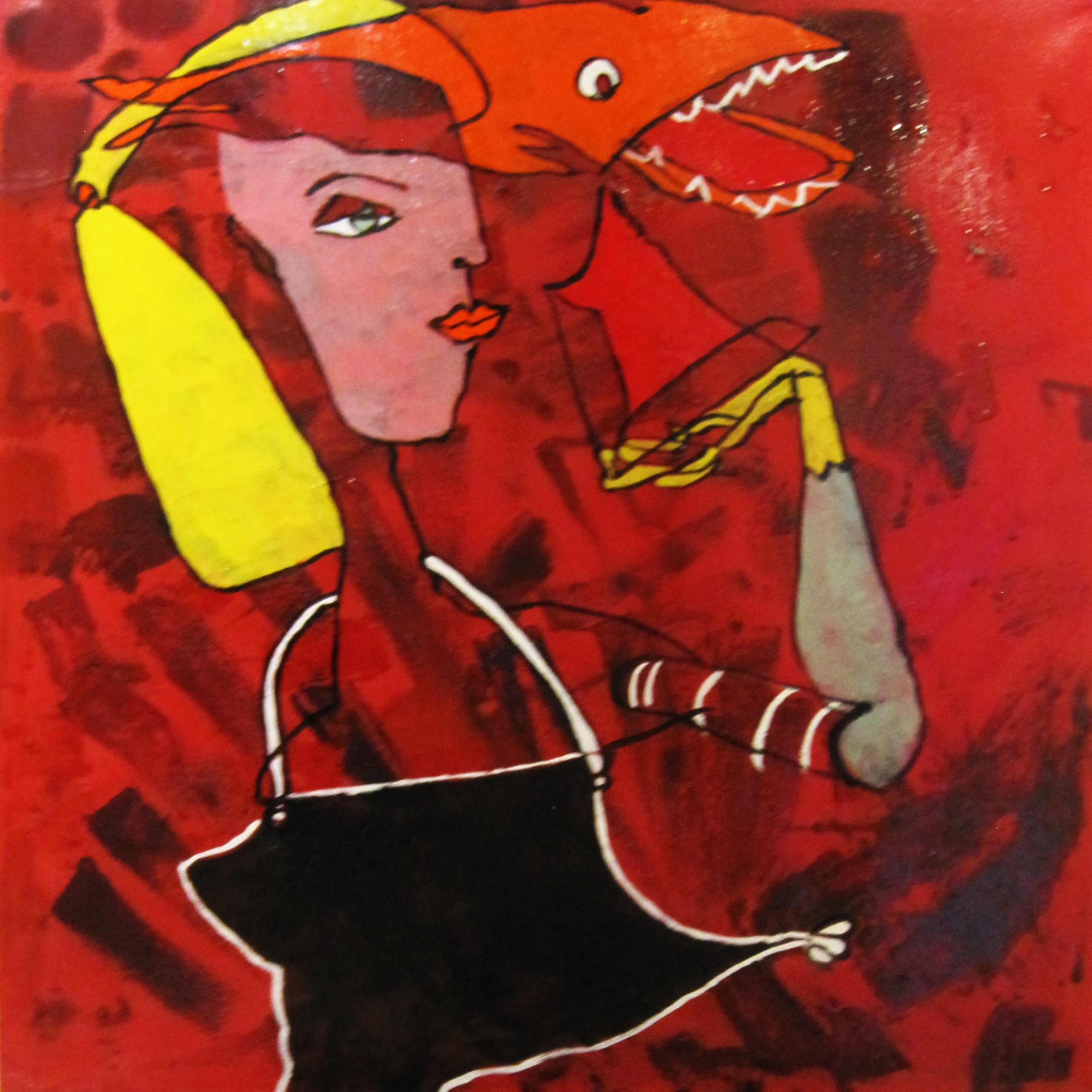 Maleri af Bentemarie Kjeldbæk – Madmarkedsdame med fisk, 90×90 cm – 8500kr.